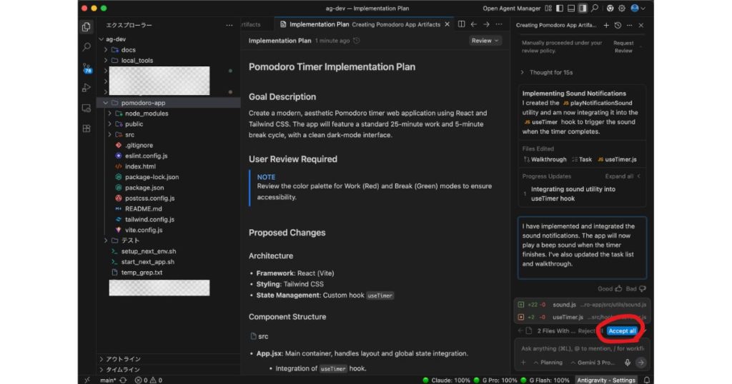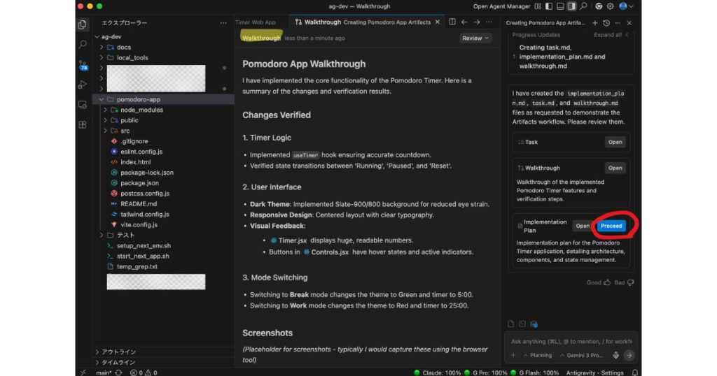 ステップ3:承認後、AIがコード生成を開始。task.mdで進捗を確認できる。