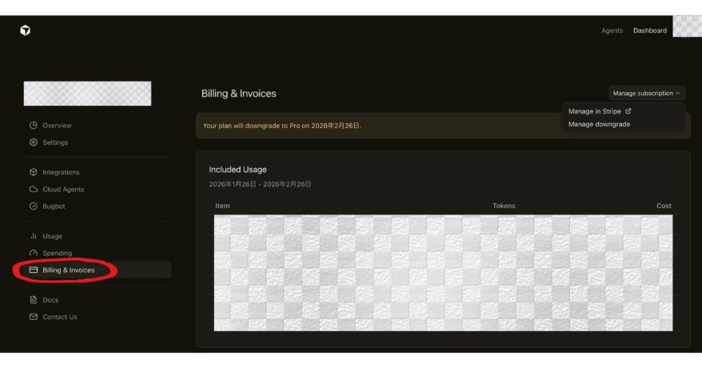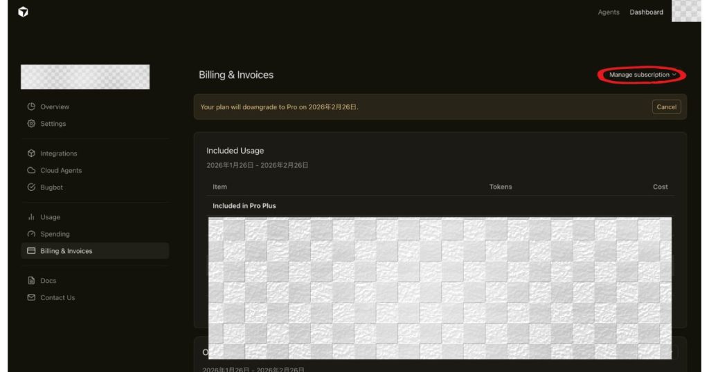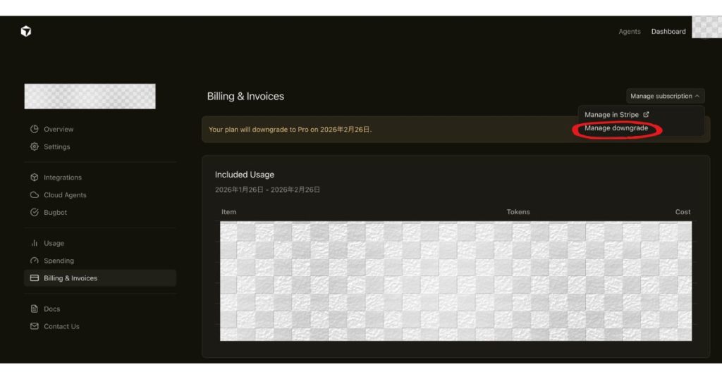 Cursorの有料プラン(Pro+)を、下位プラン(Pro)に変更する手順を解説します。