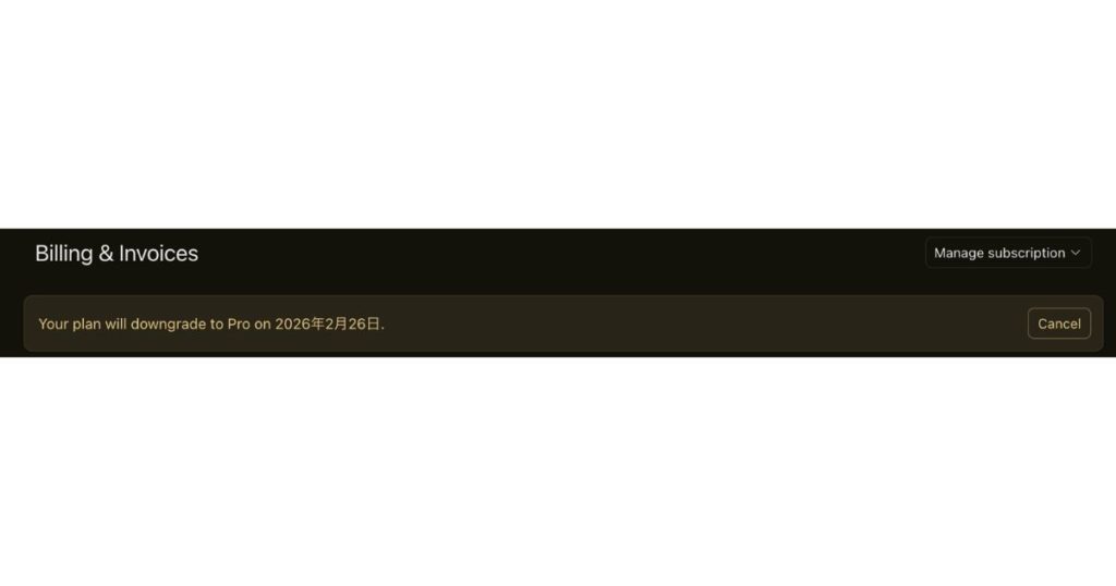 注意:ダウングレードは即時反映ではなく、現在の請求期間の終了時に有効になります。それまでは引き続きPro+プランの機能を利用できます。