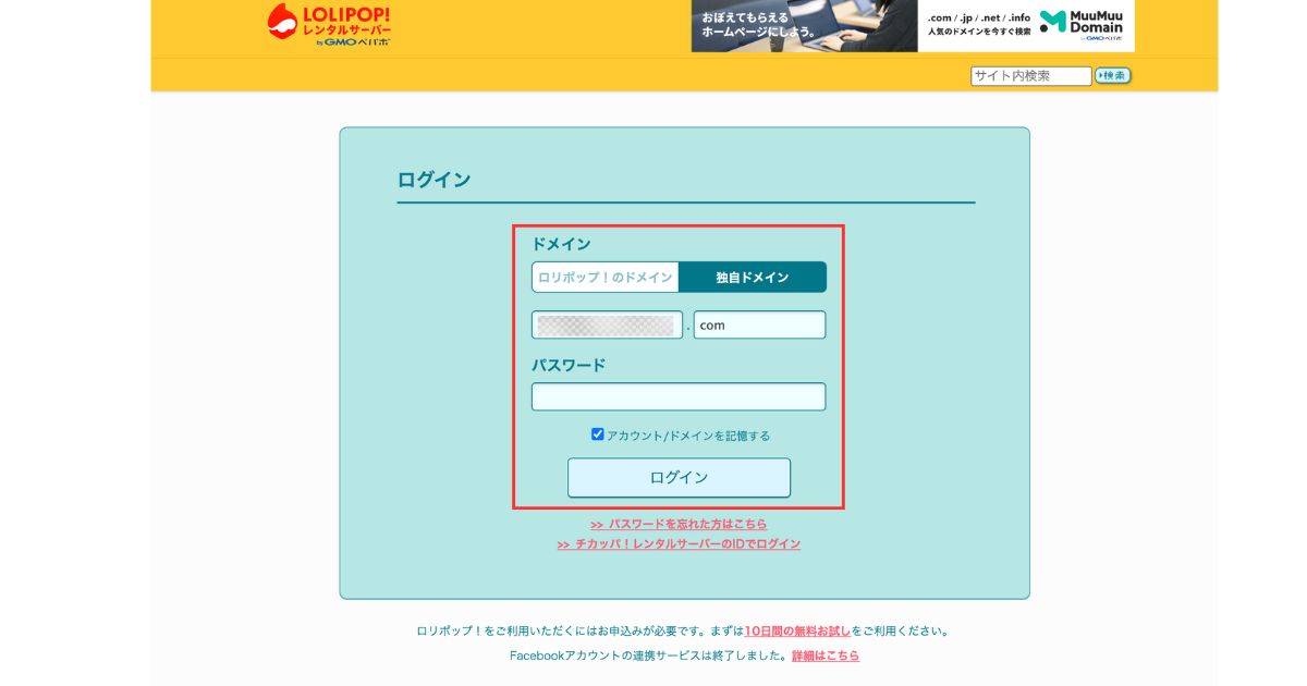 ロリポップ!ユーザー専用ページにアクセスし、ログインします。