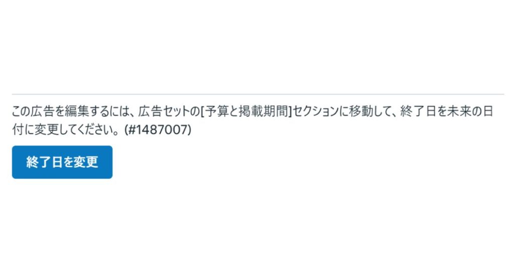 | 表示メッセージ | 「この広告を編集するには、広告セットの[予算と掲載期間]セクションに移動して、終了日を未来の日付に変更してください。(#1487007)」 |