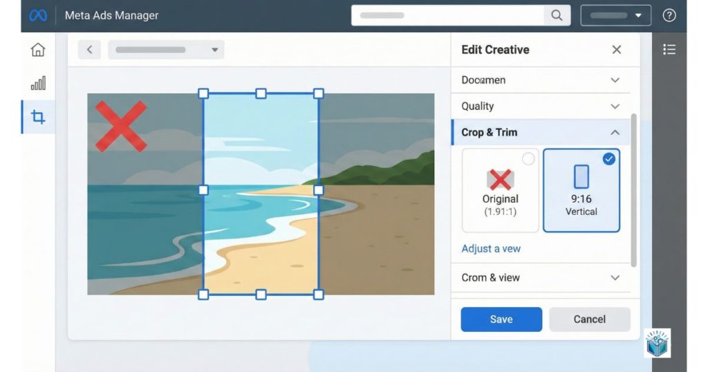 広告の編集画面を開き、クリエイティブ(Media)セクションで素材を9:16にトリミングする。