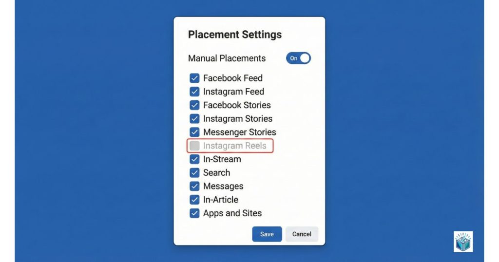 Reels用のクリエイティブを用意できない場合、Reels面を配信対象から除外することでエラーを回避する。