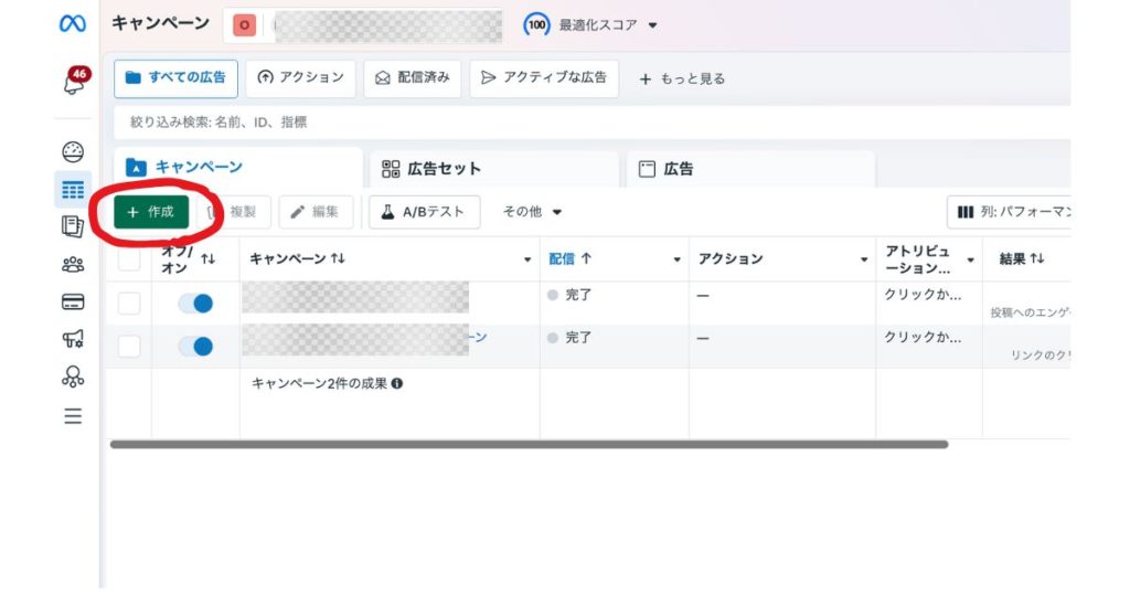 Meta広告マネージャーのキャンペーンタブから新しいキャンペーンを作成する。