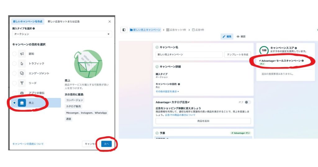 手順2:キャンペーンの目的で「売上」を選択し、Advantage+ がオンになっていることを確認する