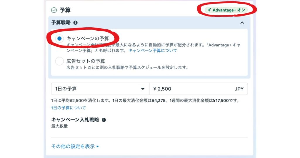 | 予算戦略 | 「キャンペーンの予算」が選択されていることを確認 ※「Advantage+ オン」の表示があればOK。これがキャンペーン予算の最適化(CBO) |
