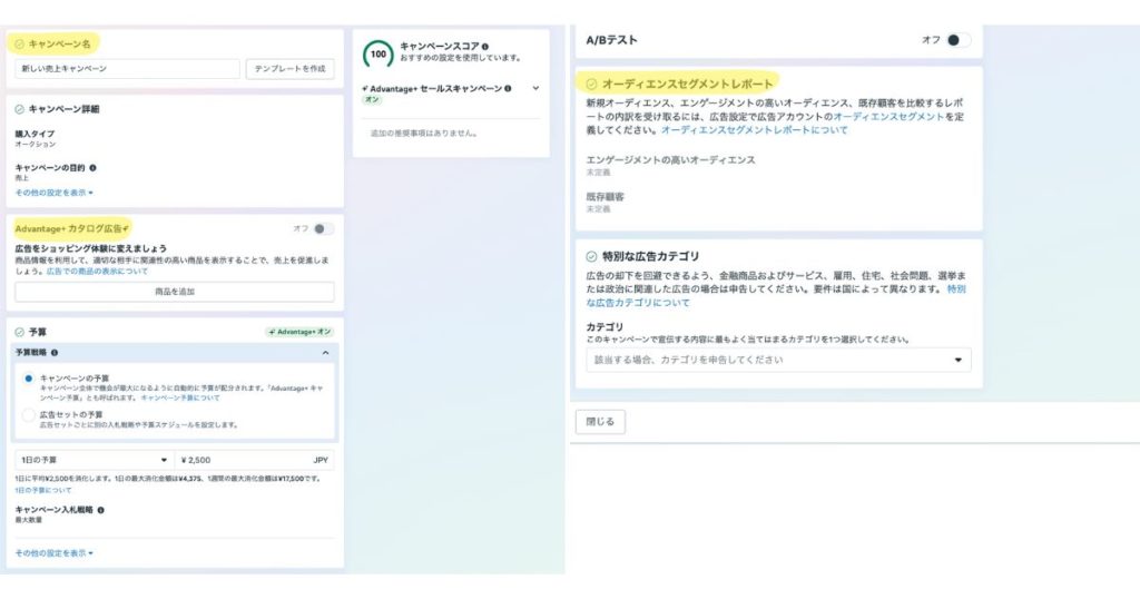| スコア100の条件 | 以下がすべてチェック✅になっている状態: ・予算:キャンペーン予算最適化がオン ・オーディエンス:Advantage+ オーディエンス拡張がオン ・配置:自動配置がオン |