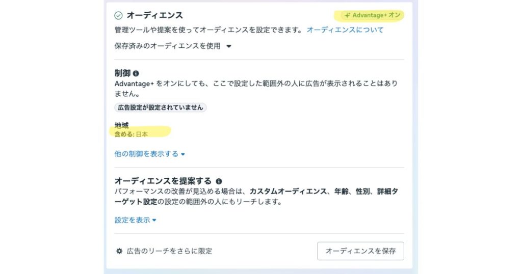 | 1 | オーディエンス設定欄の下部にある「他の制御を表示する」リンクをクリック |