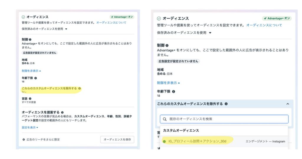 | 2 | 「カスタムオーディエンスの除外」項目が表示される |