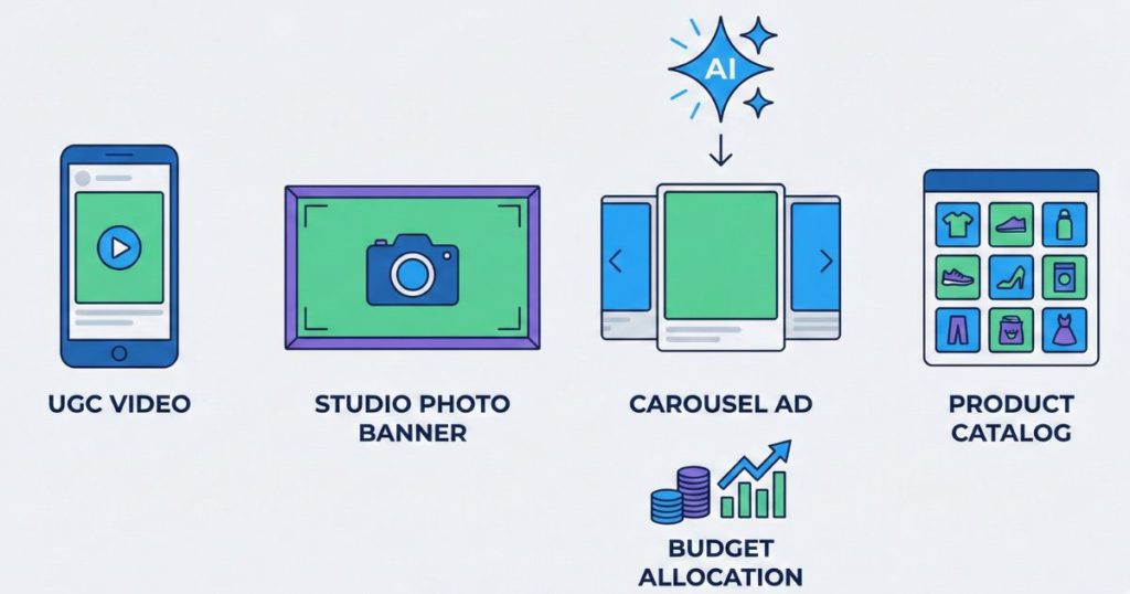 見た目や内容がほぼ同じ広告を何十本も入れても効果はない。真の多様性とは「異なるフォーマット × 異なるビジュアル × 異なるメッセージ」の組み合わせ。UGC風動画、スタジオ撮影画像、カルーセル広告などフォーマットレベルで変化をつけること。