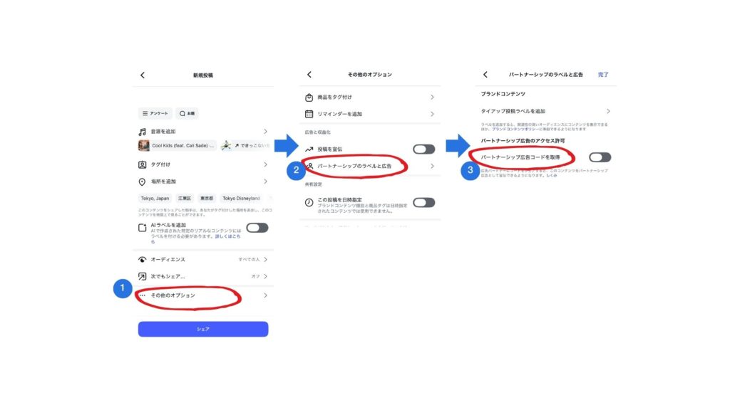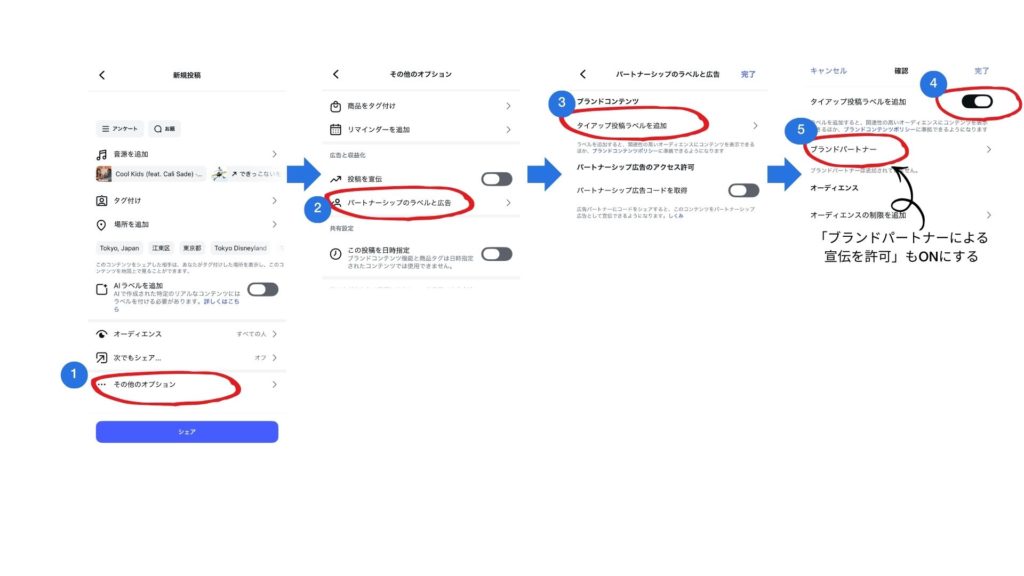 | 1. ラベル追加 | 以下の図の手順で「タイアップ投稿ラベル」をONにする |